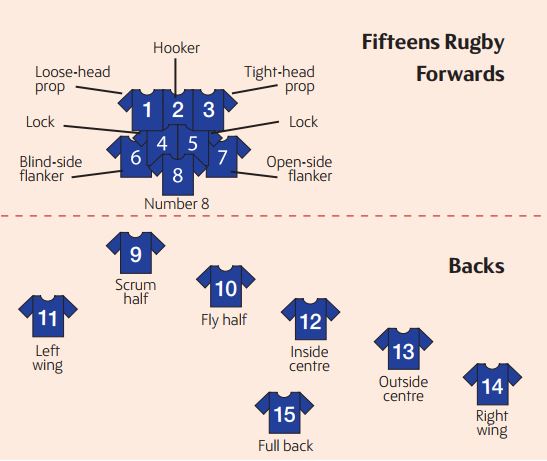 Rugby’de her iki takımda farklı özelliklerde onbeş oyuncu yer almaktadır. Forvetler sekiz kişi olarak en ağır işi yapmakta ve sürekli çarpışmanın içinde bulunmaktadırlar, 7 kişilik Bek kadrosu ise daha çok; topu ağır adamlardan kaçırmak ve boşluk bulmak üzere odaklanmışlardır.